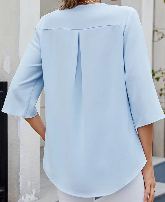 - Features: Ruffled V-neck, 3/4 Slit Cuff Sleeve