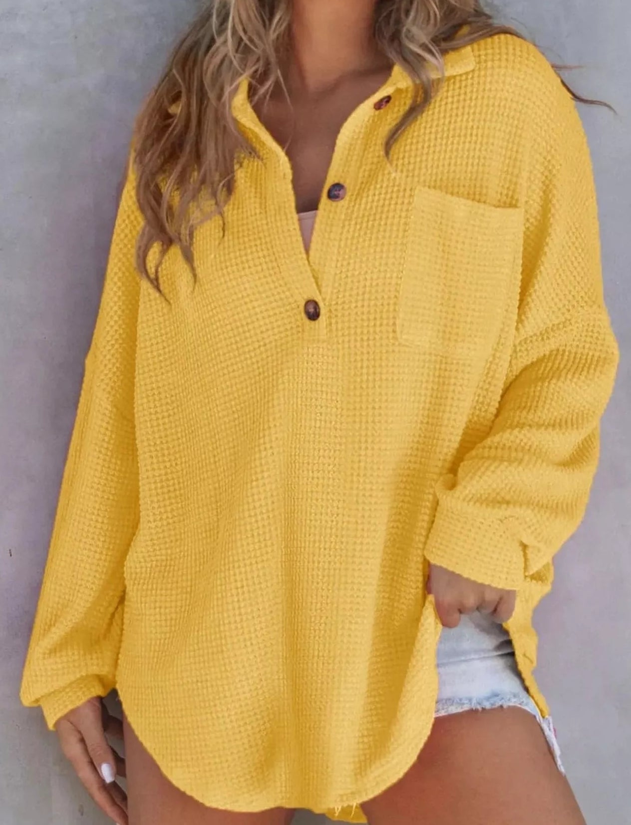 - Features: Waffle-Knit, Buttoned, Pocketed, Oversized