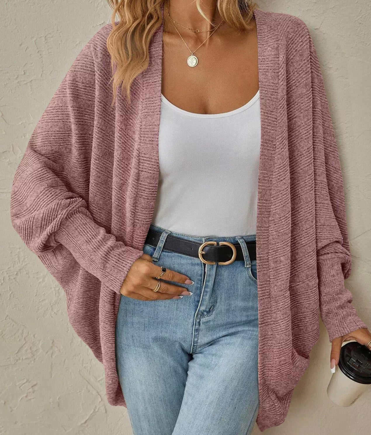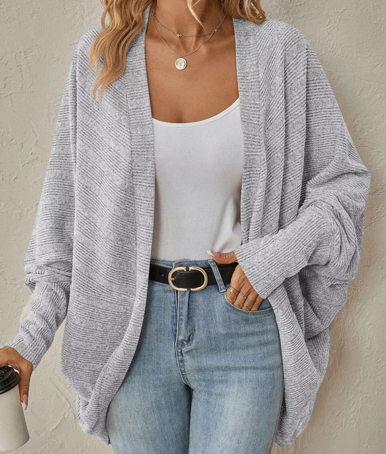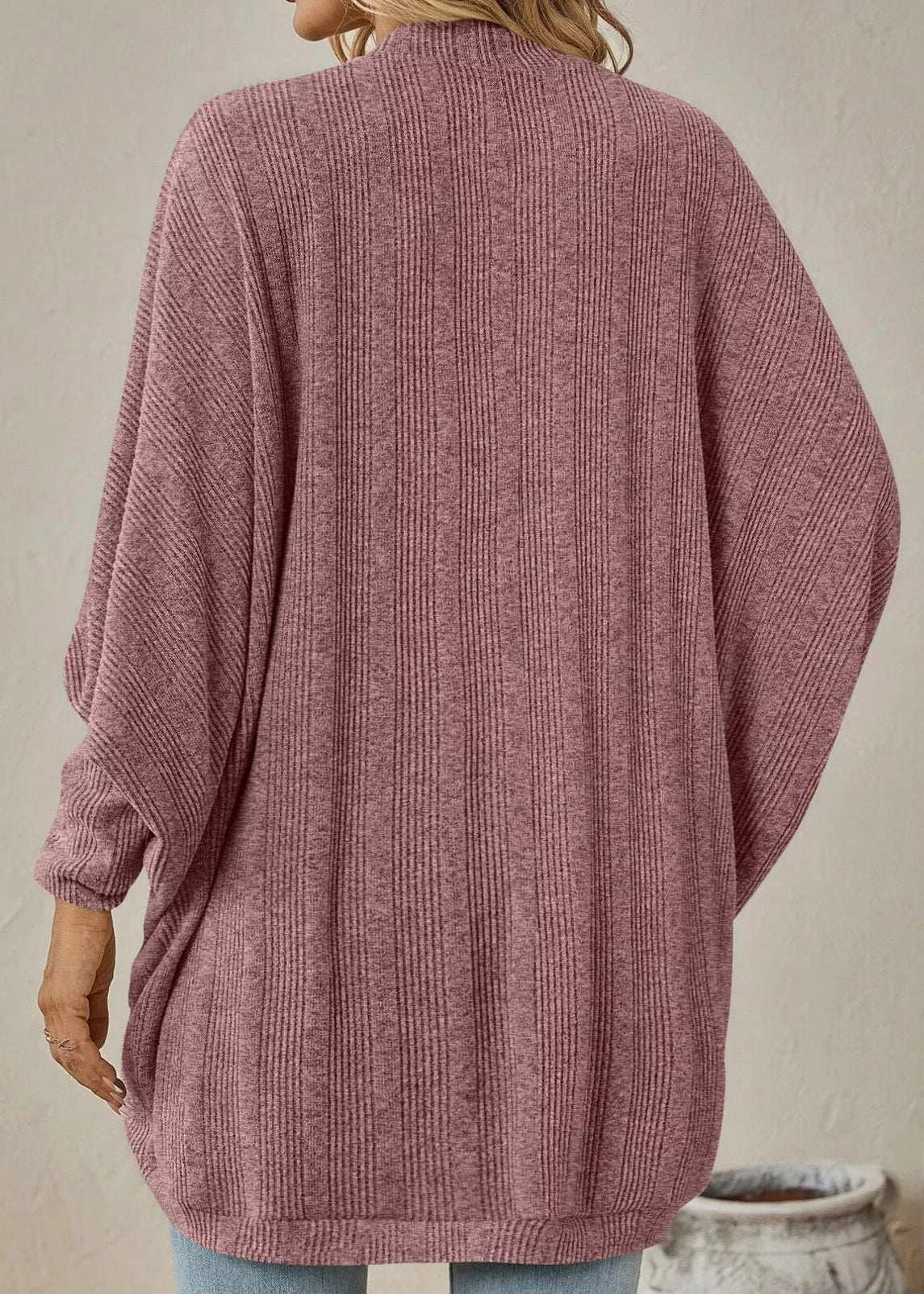 - Features: Oversized, Open Front, Ribbed, Angel Wing Sleeves