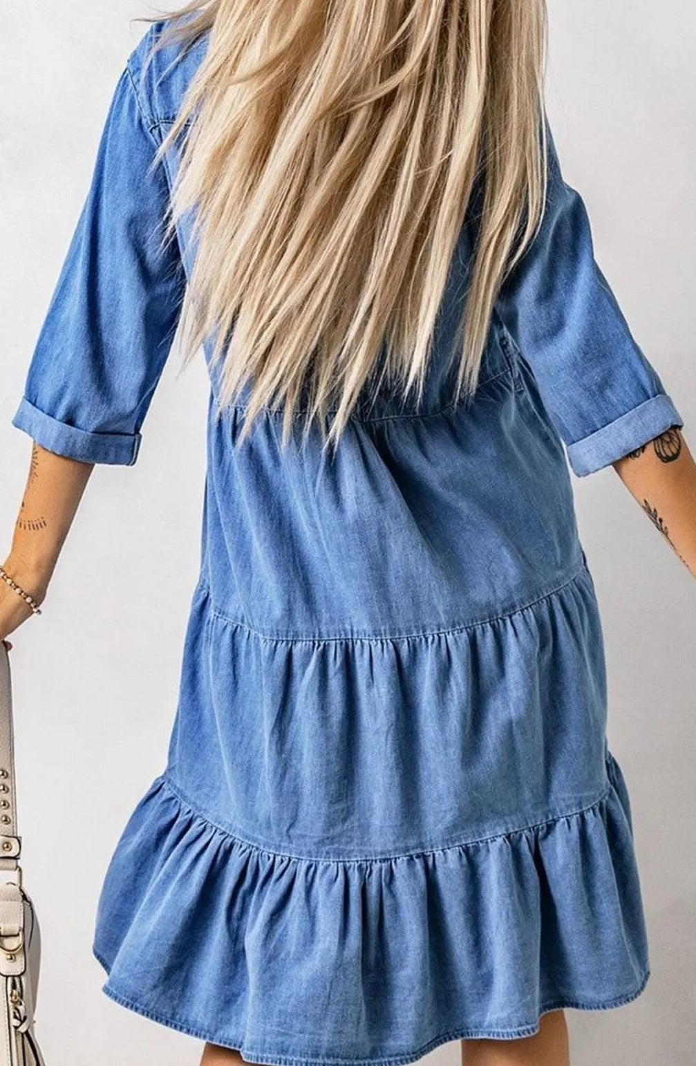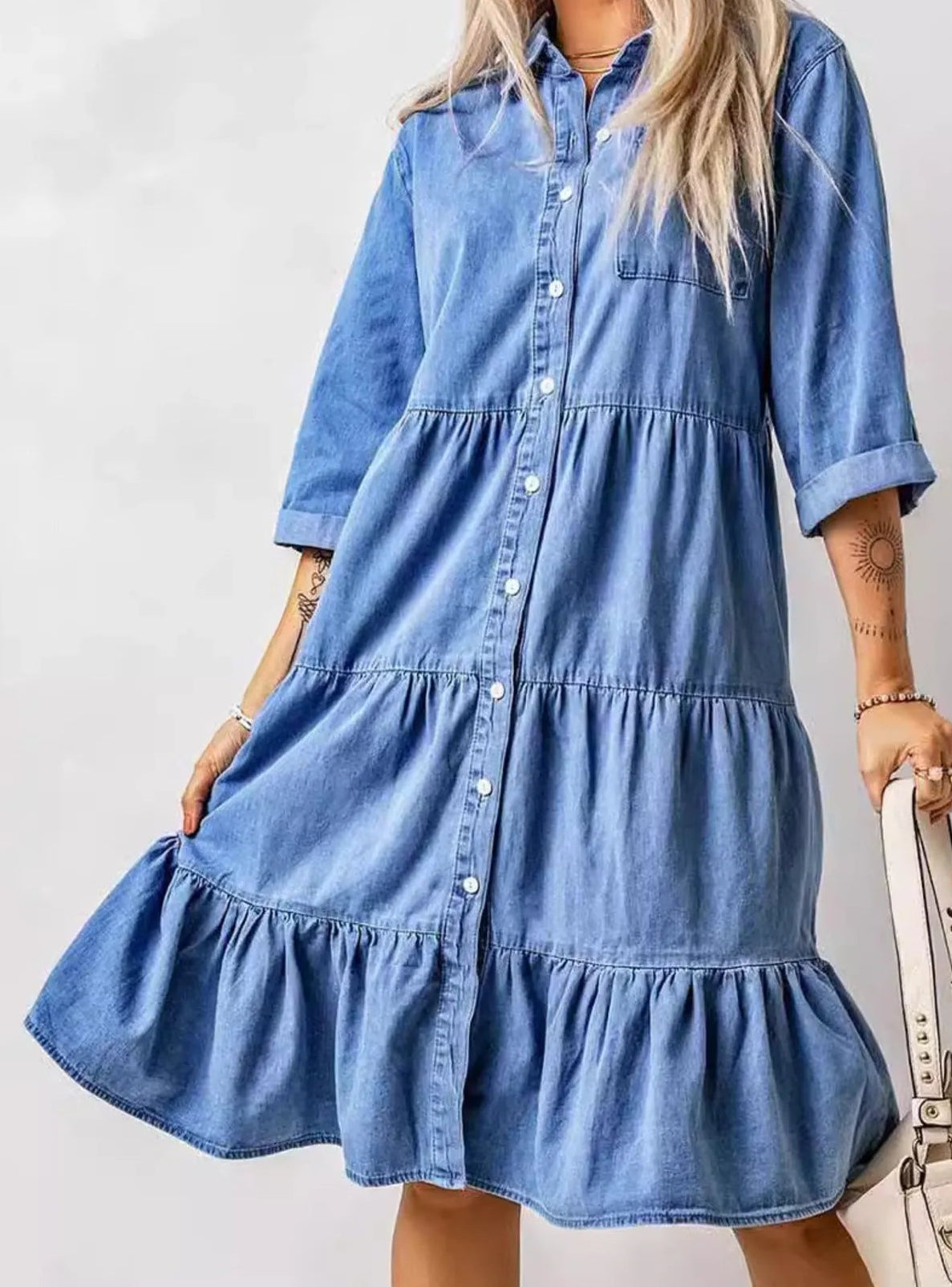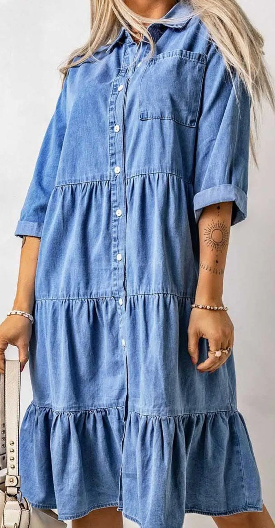- Features: Collared, 3/4 Sleeve, Button Up, Breast Pocket, Tiered