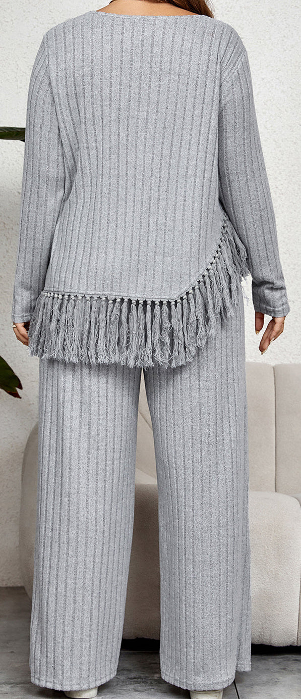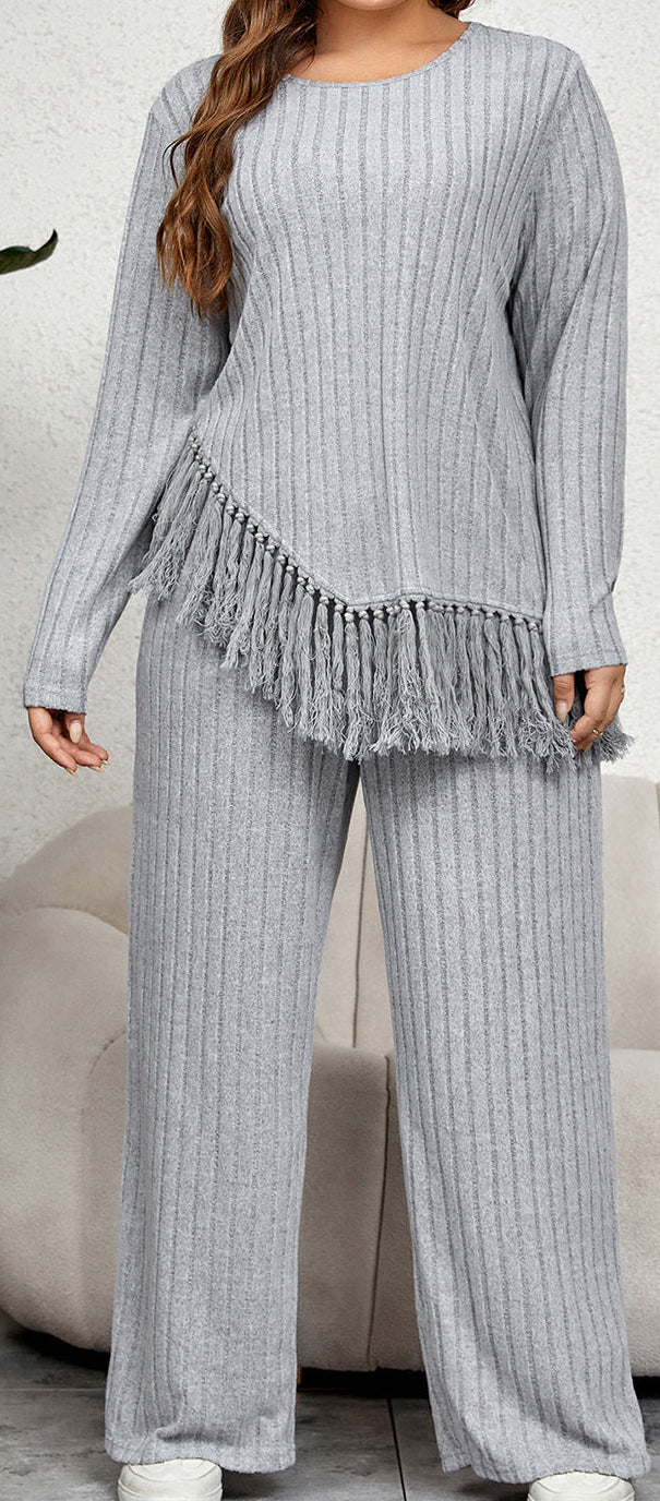 - Features: Rounded Neck, Angled Hem, Tassels, Elastic Waist