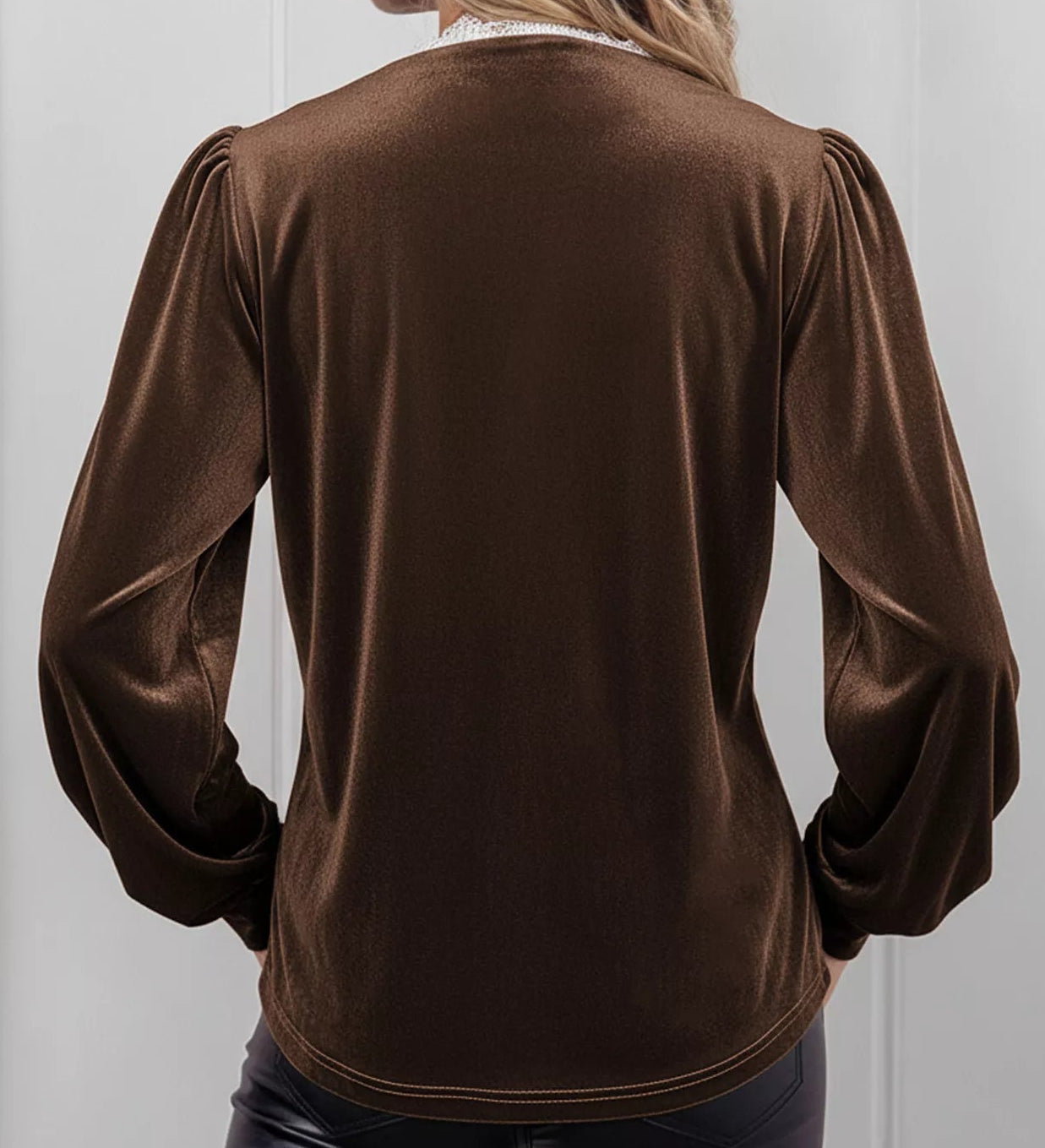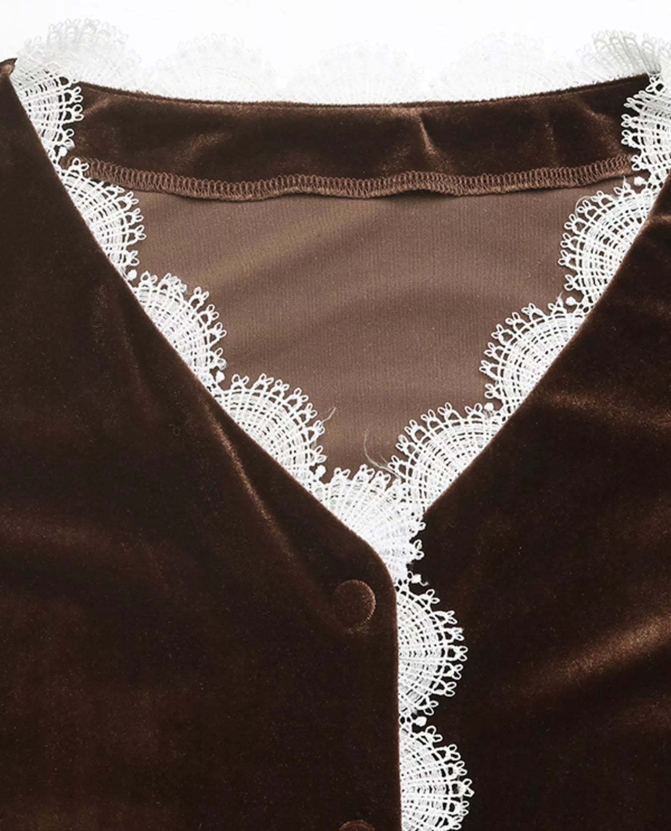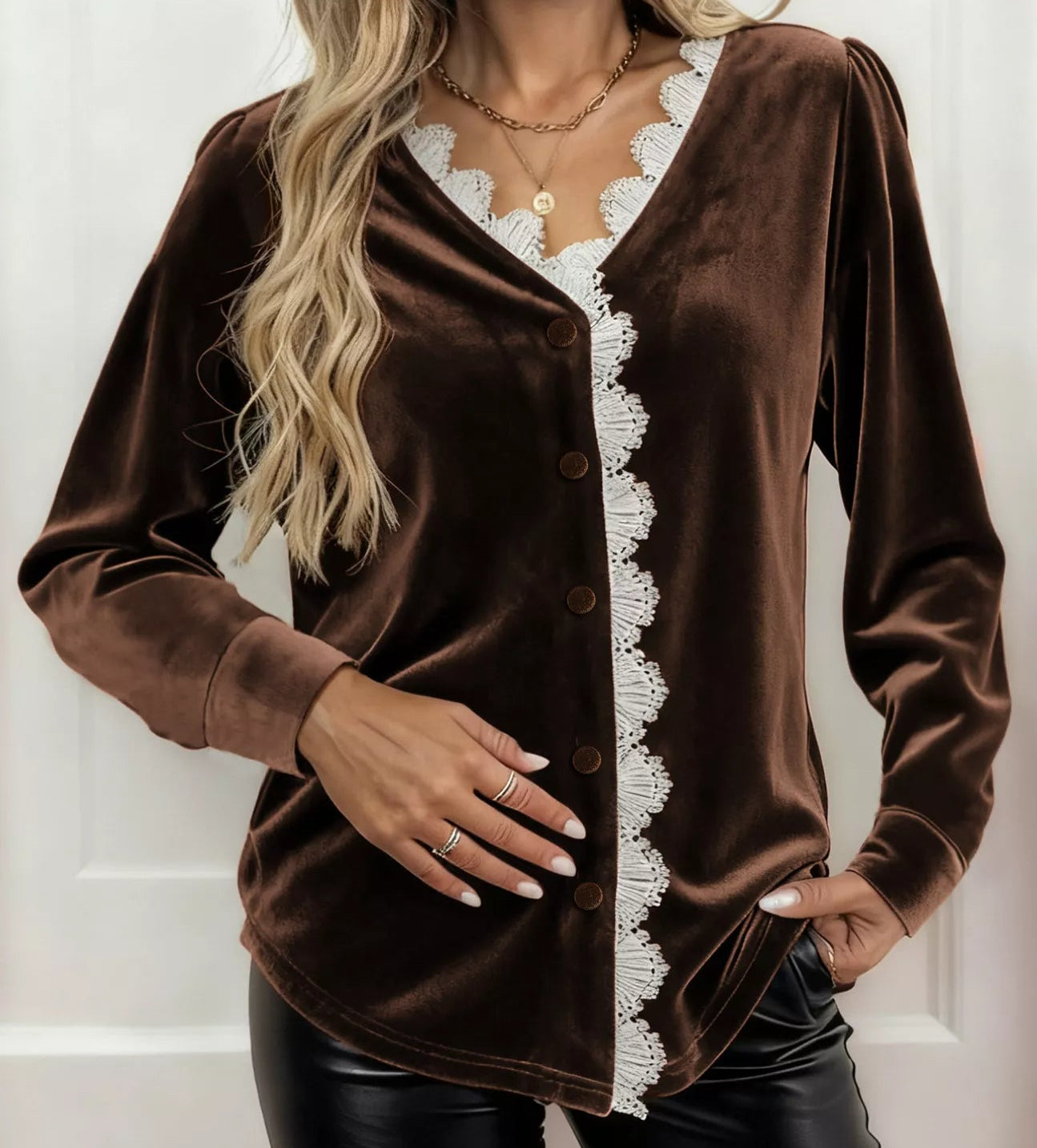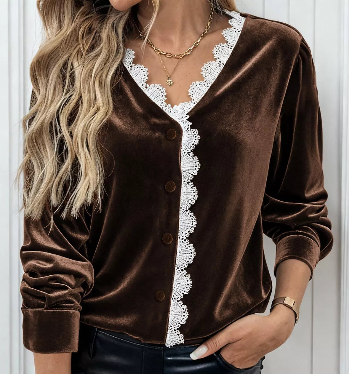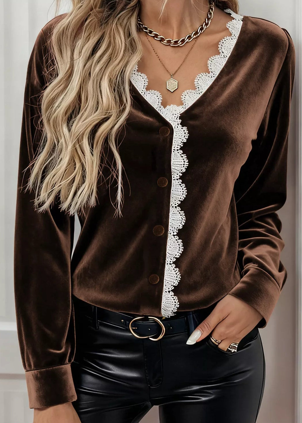 - Features: Lace Detail, V-neck, Button Up