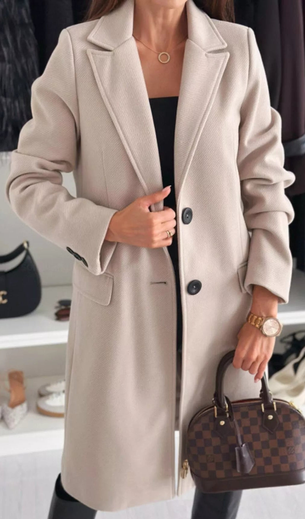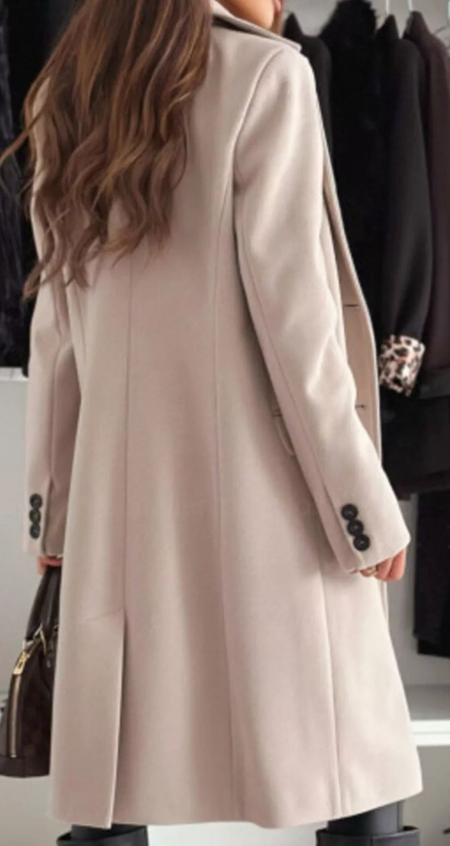 - Features: Collared, Buttoned, Pocketed, Knee Length