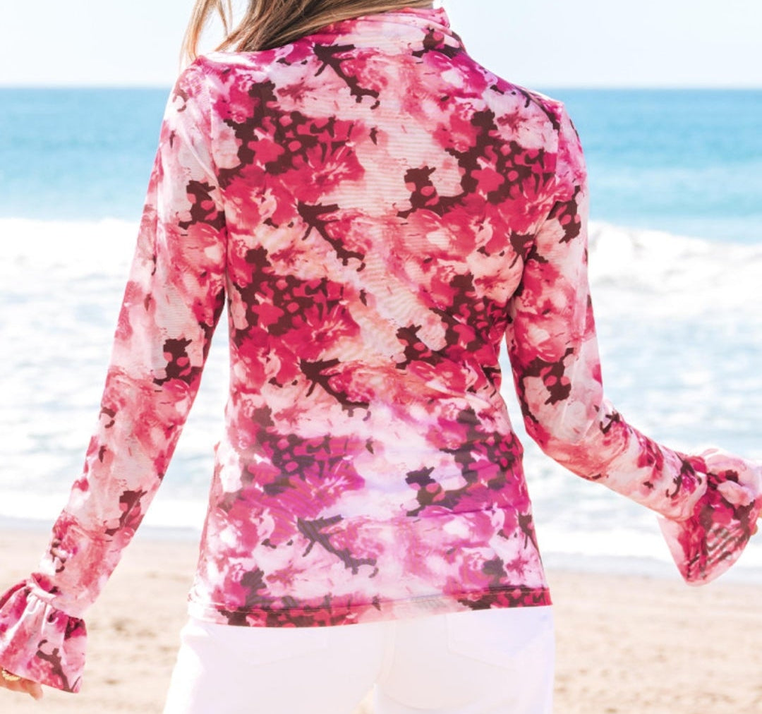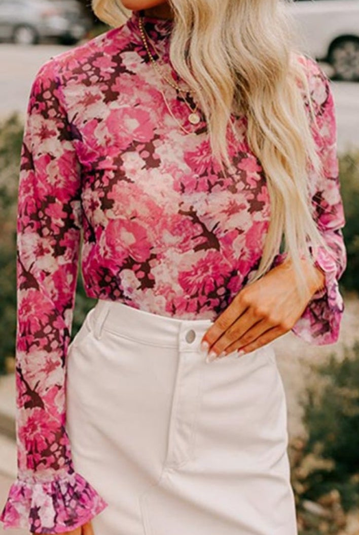 Sheer, Mock Neck, Ruffled Cuff, Stretchy
