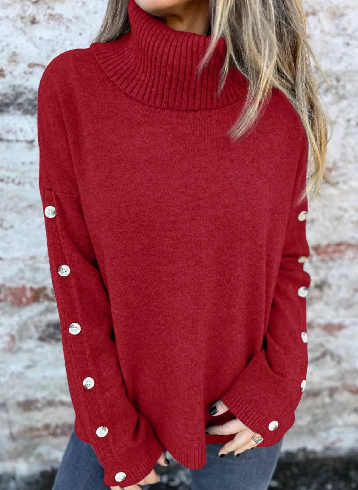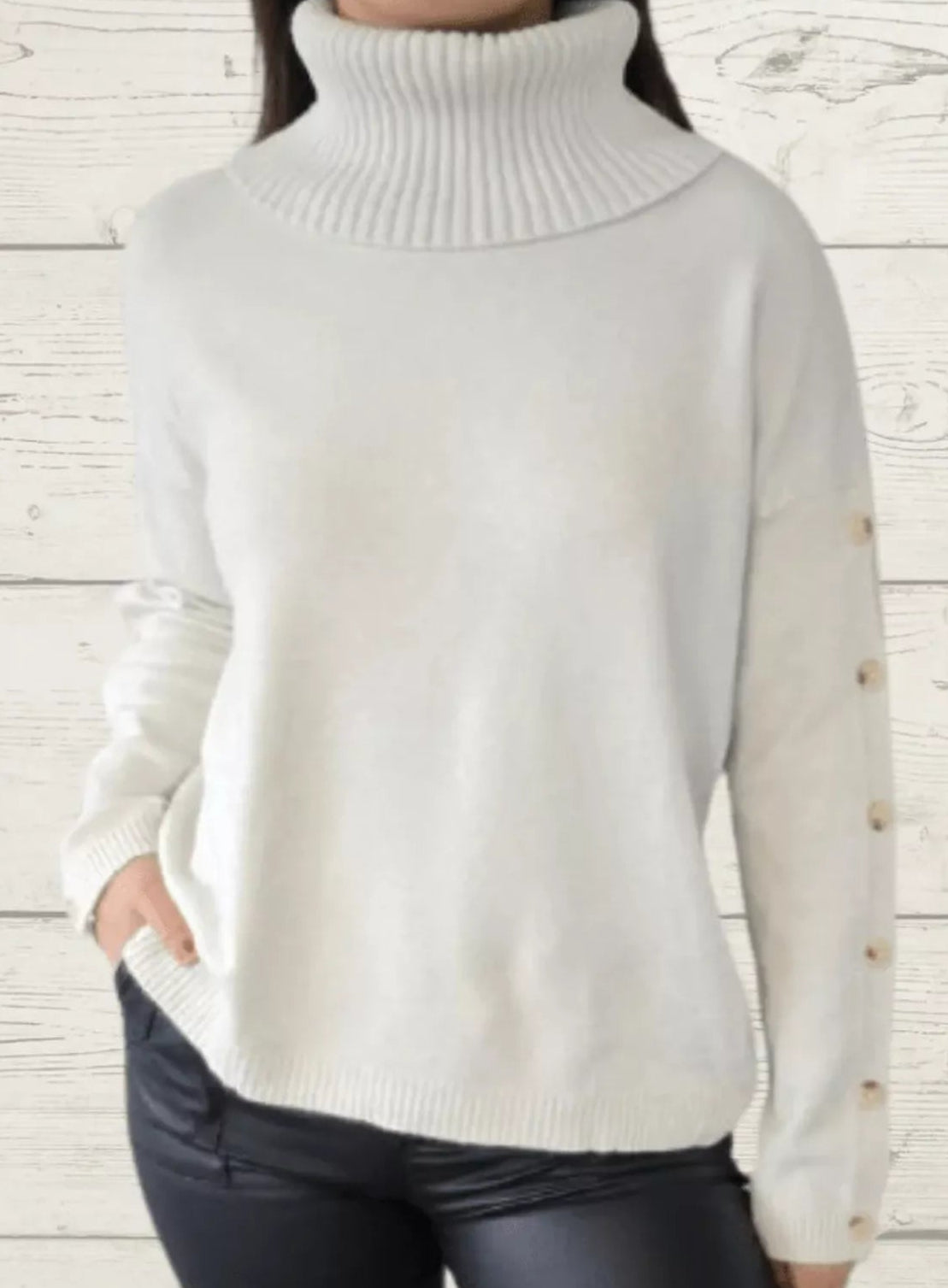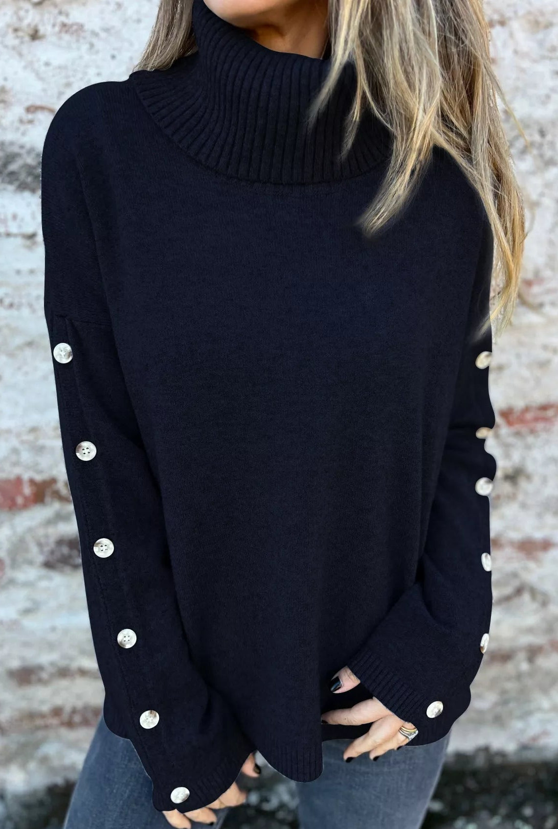 - Features: Turtleneck, Ribbed, Decorative Button