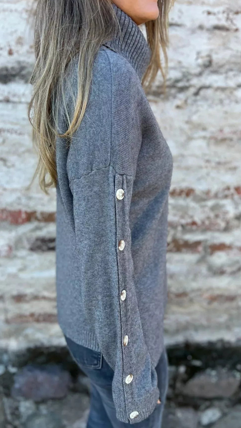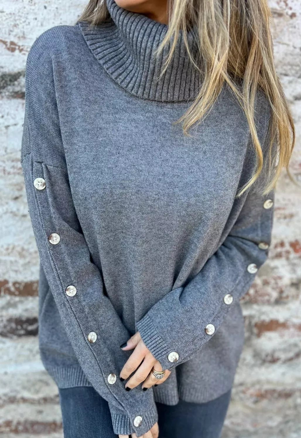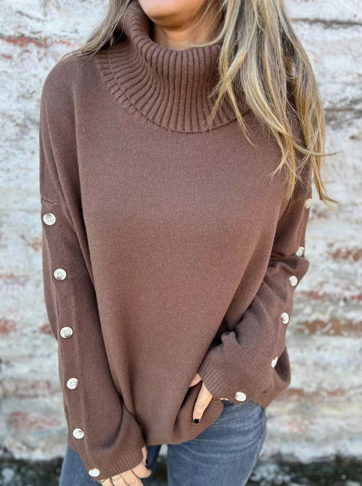 - Features: Turtleneck, Ribbed, Decorative Button